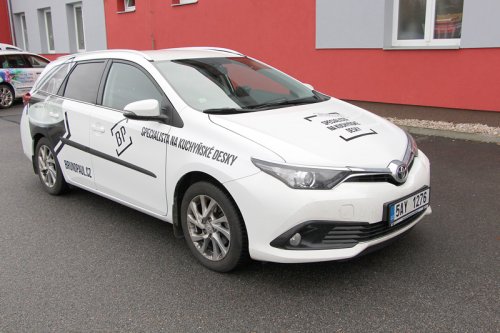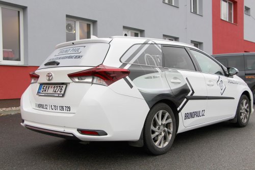 Částečný polep vozu Toyota Auris. Na okna byl použit polep certifikovanou onevision folií. Kreativní grafický návrh a realizace Jirout reklamní agentura.